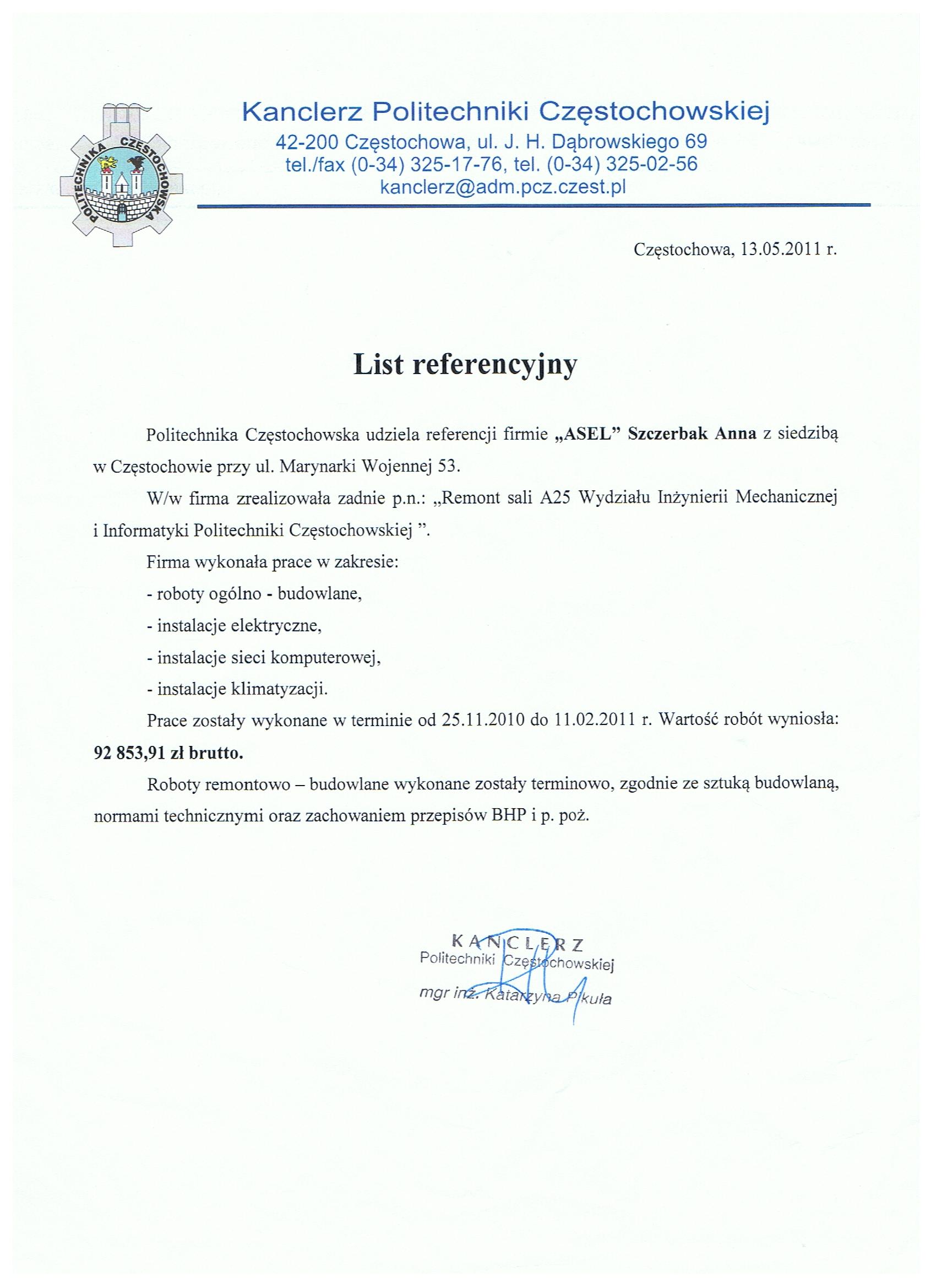 - Wykonawstwo instalacji elektrycznych (zasilania, sterowania oraz sieci informatycznych LAN)